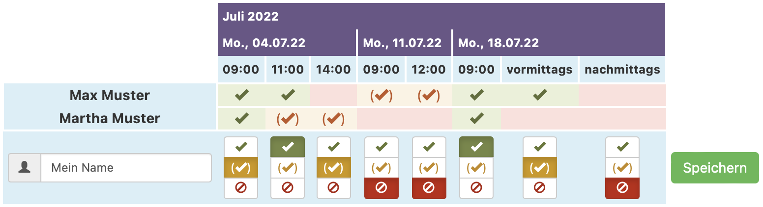 Geben Sie links in das Feld Ihren Namen ein und wählen dann in Ihrer Zeile einfach über die Icons ob Sie an dieser Option können , wahrscheinlich können () oder nicht können . Anschließend klicken Sie auf den Button Speichern um Ihre Stimme abzugeben.